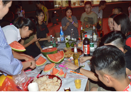 跑步结束后,紧接着烧烤活动正式开始,随着音乐响起,场面十分热闹,一片欢声笑语的。员工们把烧烤桌拼在一起,有的在品者美味的烧烤,有的在玩游戏,有的在开心的交谈着,场面温暖而热烈。