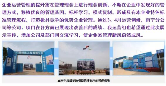 通过运营调研,调研双方依据8S现场管理方针进行管理检验,发现运营管理存在的问题并提出合理的整改方案。调研工作在各公司、项目组积极配合下,取得实质性工作进展,也为企业形成良好的工作作风,树立标杆管理,提供创新管理的新思路。