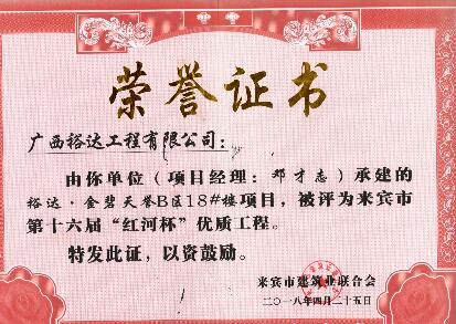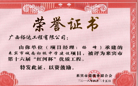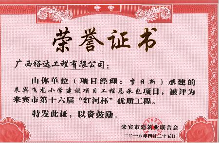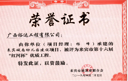 承建的“来宾城南幼儿园建设项目”“来宾市城南初级中学建设项目”“来宾飞龙小学建设项目工程总承包”“裕达·金碧天誉B区17#楼”和“裕达·金碧天誉B区18#楼”共5项工程项目被评为来宾市第十六届“红河杯”优质工程,这是继2011年至2017年荣获的25项“红河杯”优质工程之后,再获此荣誉。