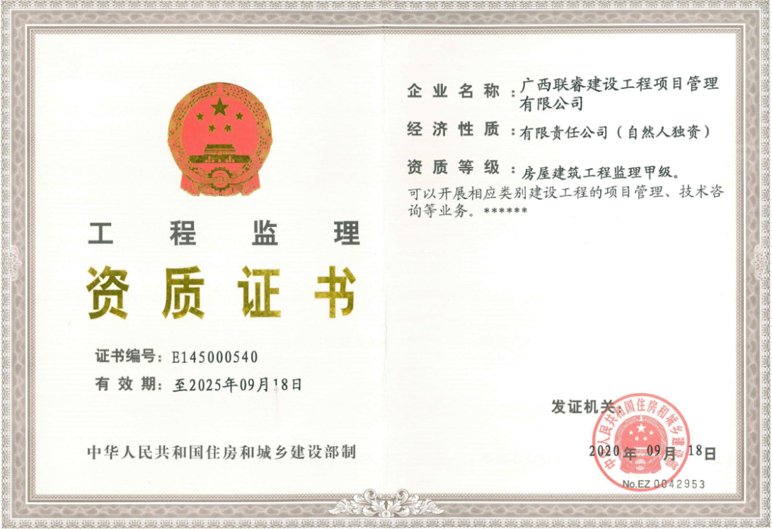 2020年10月9日,联睿公司正式收到国家住建部下发的新资质证书,标志着联睿公司升甲工作圆满成功。