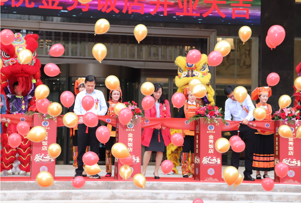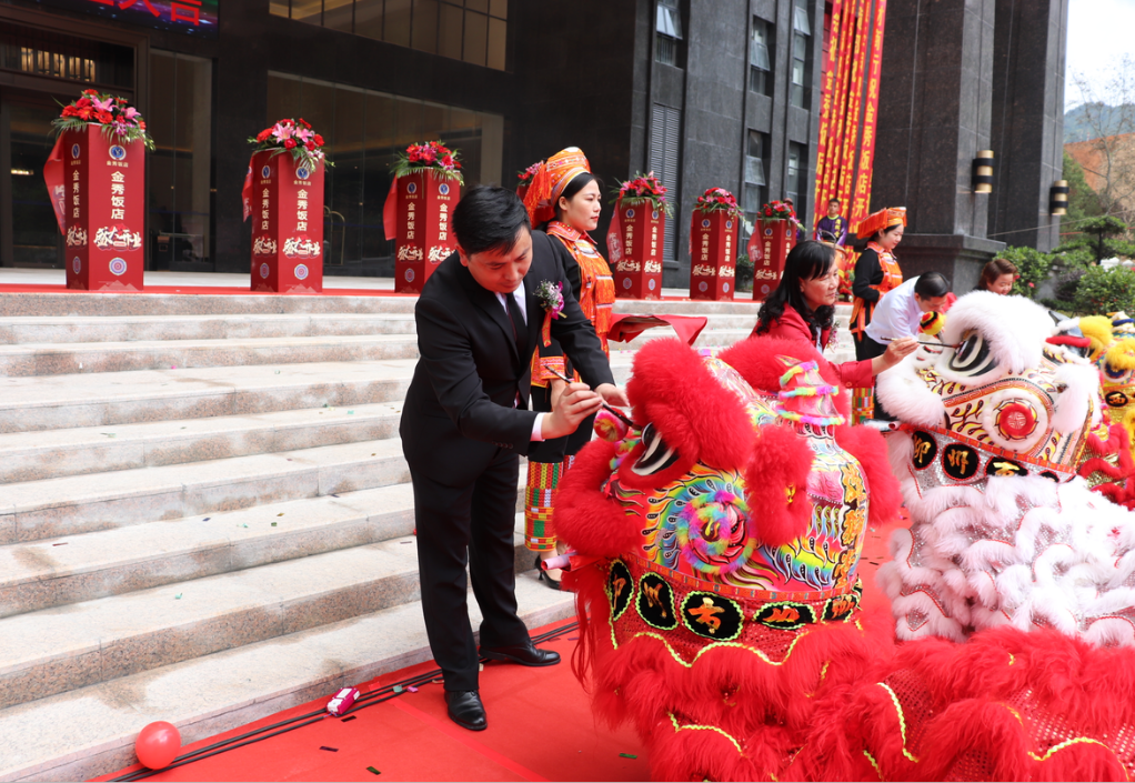 本次开业典礼规模盛大,现场鲜花锦簇,场面热闹非凡,仪式设有剪彩环节、睡狮点睛、接财闹场等精彩纷呈的表演。参加庆典的金秀县 “四家班子”领导代表与我集团领导代表一行9人共同为金秀饭店的开业剪彩。金秀县政协主席梁爱华、裕达控股集团副总裁梁锋、裕达控股集团执行副总裁兼来宾县区域公司董事长李梦晓、裕达控股集团总裁助理兼旅游集团总裁何道军4位领导共同为睡狮点睛,将本次开业典礼推向高潮。