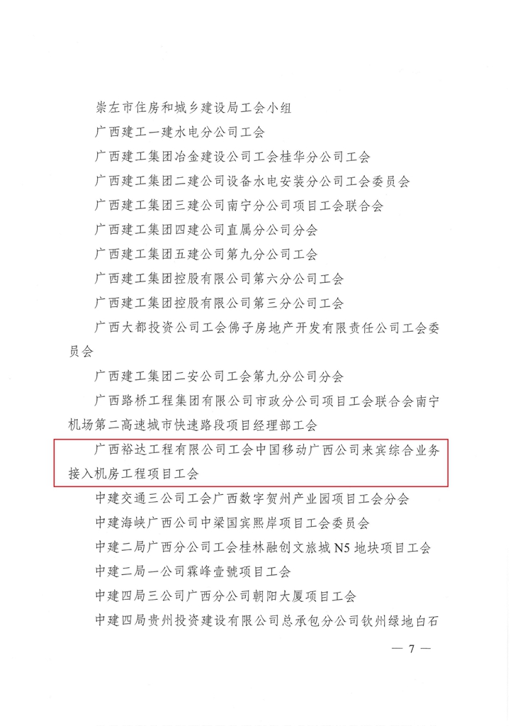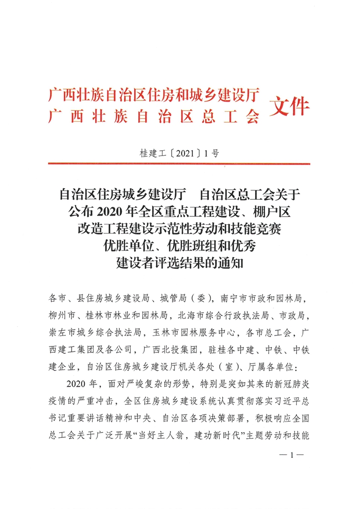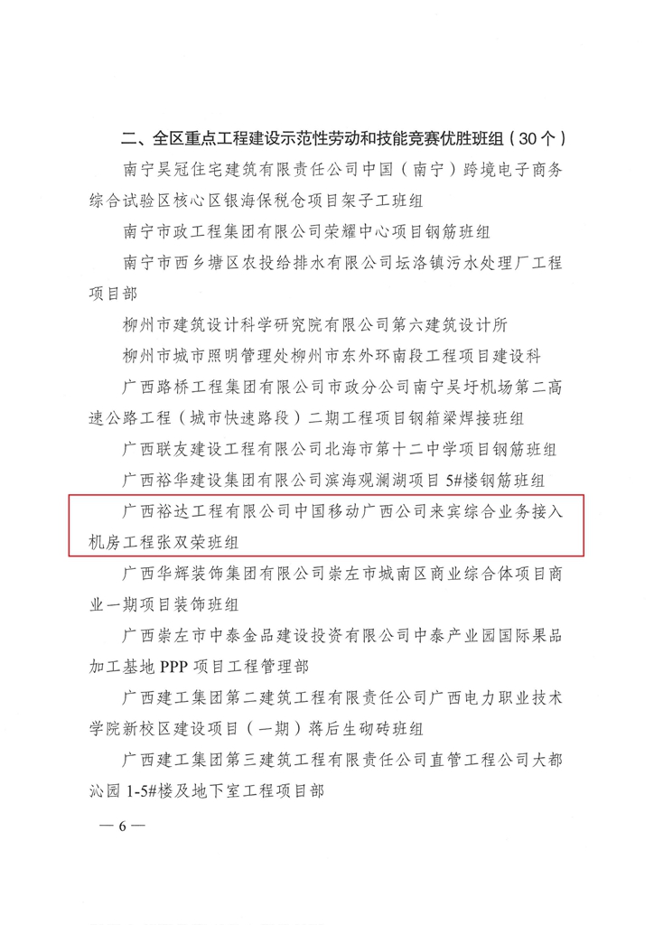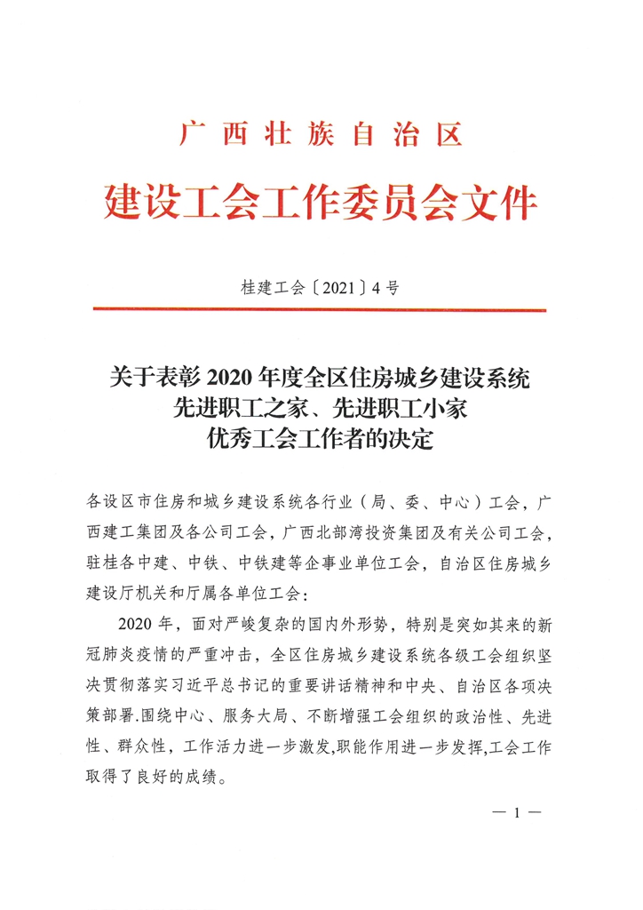 近日,从自治区住建厅及自治区总工会获悉,工程公司自营项目—中国移动广西来宾综合业务接入机房工程(简称“移动项目”)再获表彰,荣获“2020年度全区重点工程建设示范性劳动和技能竞赛优胜班组”和“2020年度全区住房城乡建设系统先进职工小家”荣誉称号。