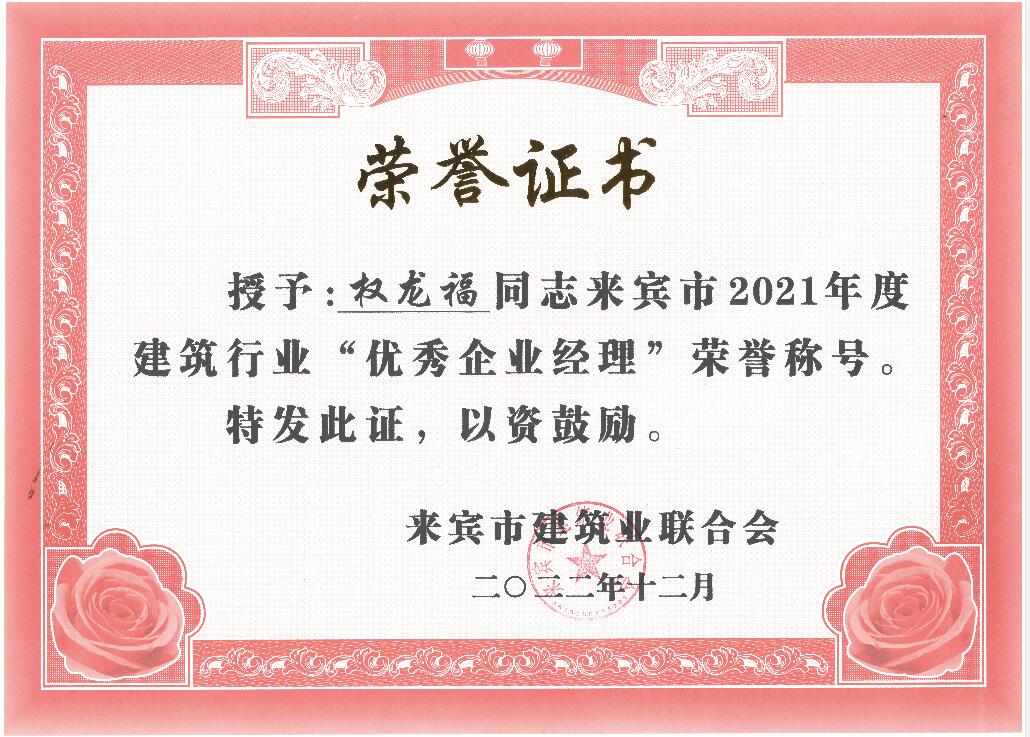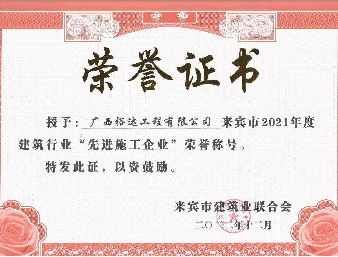 来宾市住房和城乡建设局对来宾市建筑行业2021年度的先进集体和优秀个人进行表彰,工程公司获“来宾市建筑业先进企业”荣誉,公司总经理权龙福还被评为“来宾市建筑业优秀企业经理”,公司徐海兵等8位员工被评为“来宾市建筑业优秀建造师”;公司胡海深等8位员工被评为“来宾市建筑业优秀安全员”。这些荣誉是公司全体员工一直以来辛勤耕耘和默默无闻奉献的结果以及肯定,是工程公司综合实力不断提升和行业良好信誉的再次体现,显示工程公司得到社会和同行的认可,必将“裕达品牌”的影响力和竞争力提上新的台阶。