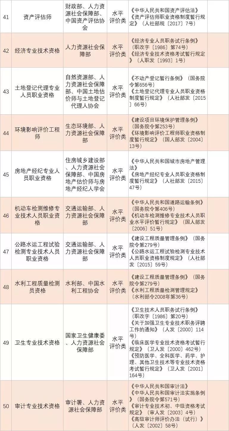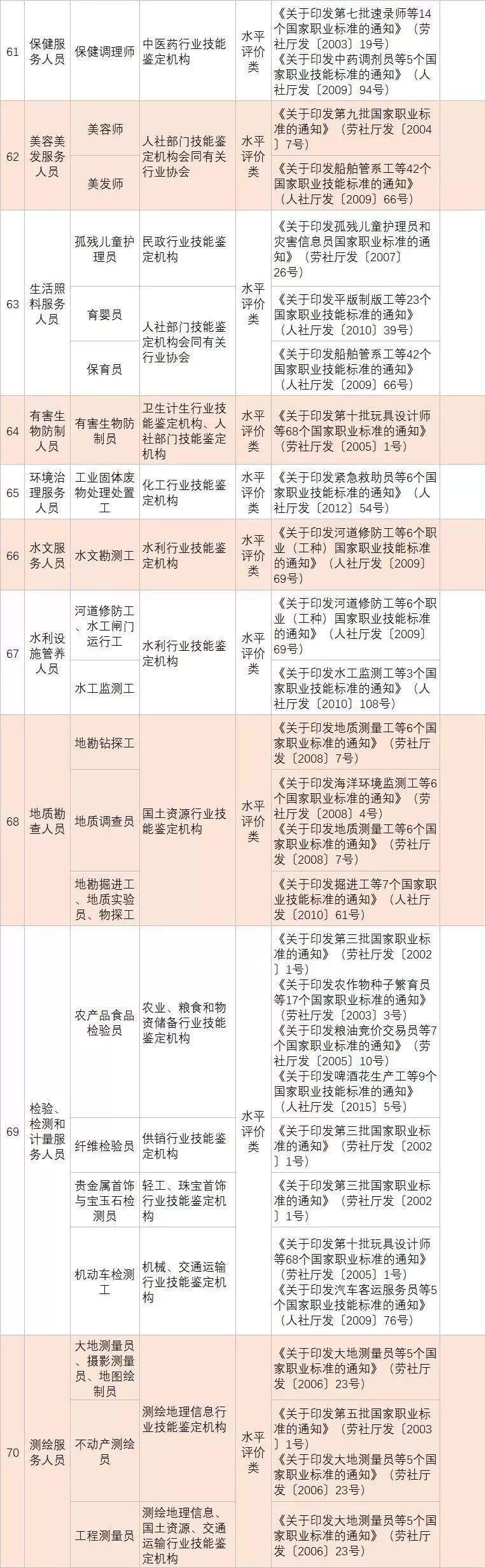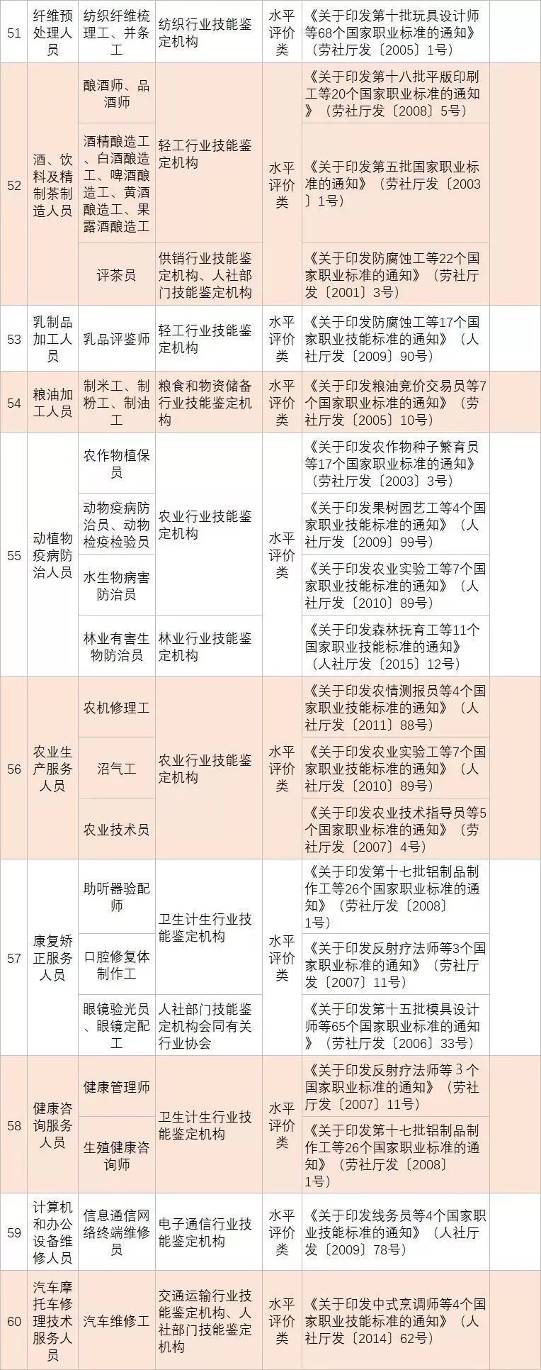 (四)深化技能人员职业资格制度改革。巩固职业资格改革成果,完善国家职业资格目录。对准入类职业资格,继续保留在国家职业资格目录内。对关系公共利益或涉及国家安全、公共安全、人身健康、生命财产安全的水平评价类职业资格,要依法依规转为准入类职业资格。对与国家安全、公共安全、人身健康、生命财产安全关系不密切的水平评价类职业资格,要逐步调整退出目录,对其中社会通用性强、专业性强、技术技能要求高的职业(工种),可根据经济社会发展需要,实行职业技能等级认定。