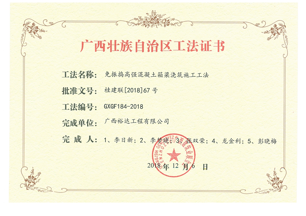 2018年广西壮族自治区工法证书(免振捣高强混凝土箱梁浇筑施工工法)
