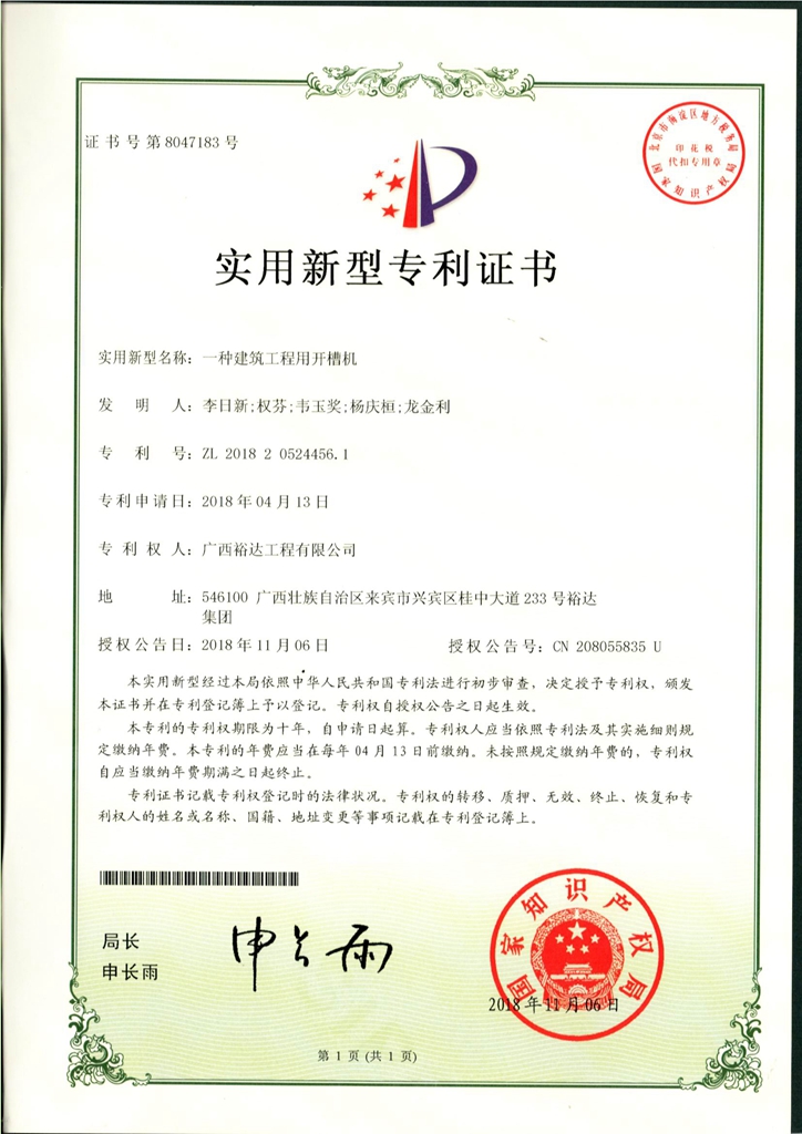 2018年实用新型专利证书(一种建筑工程用开槽机)
