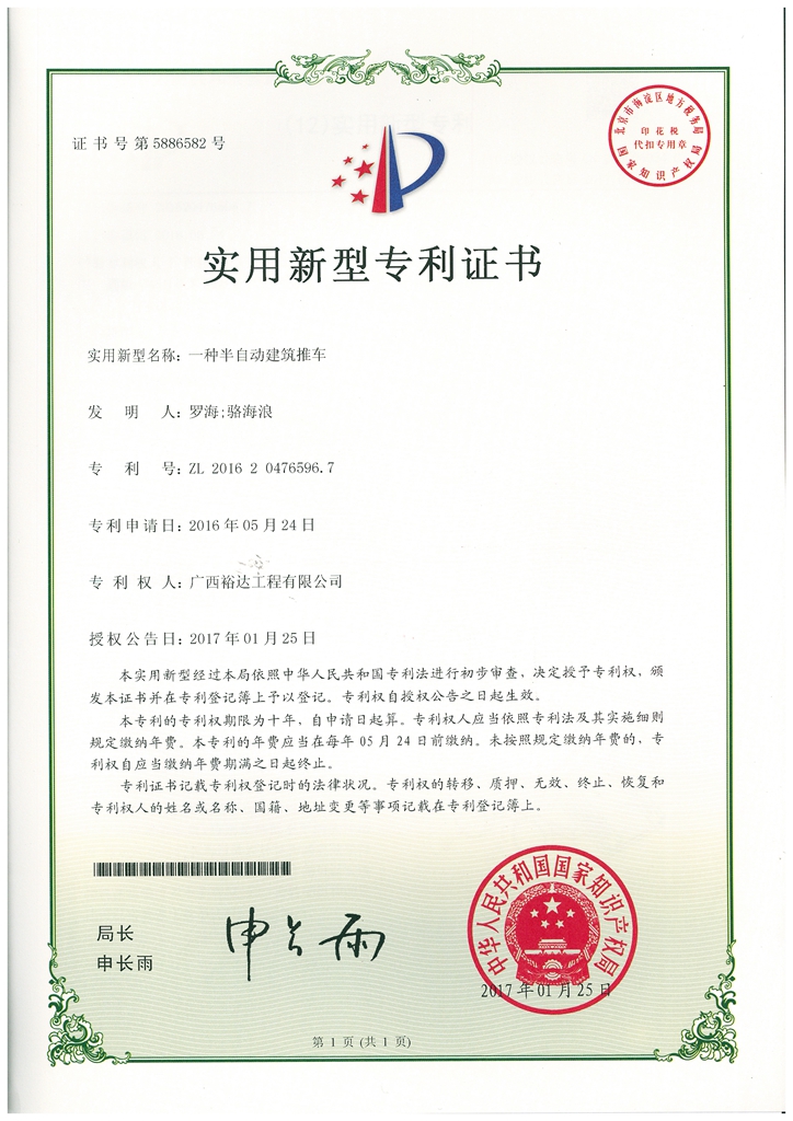 2017年实用新型专利证书(一种半自动建筑推车)