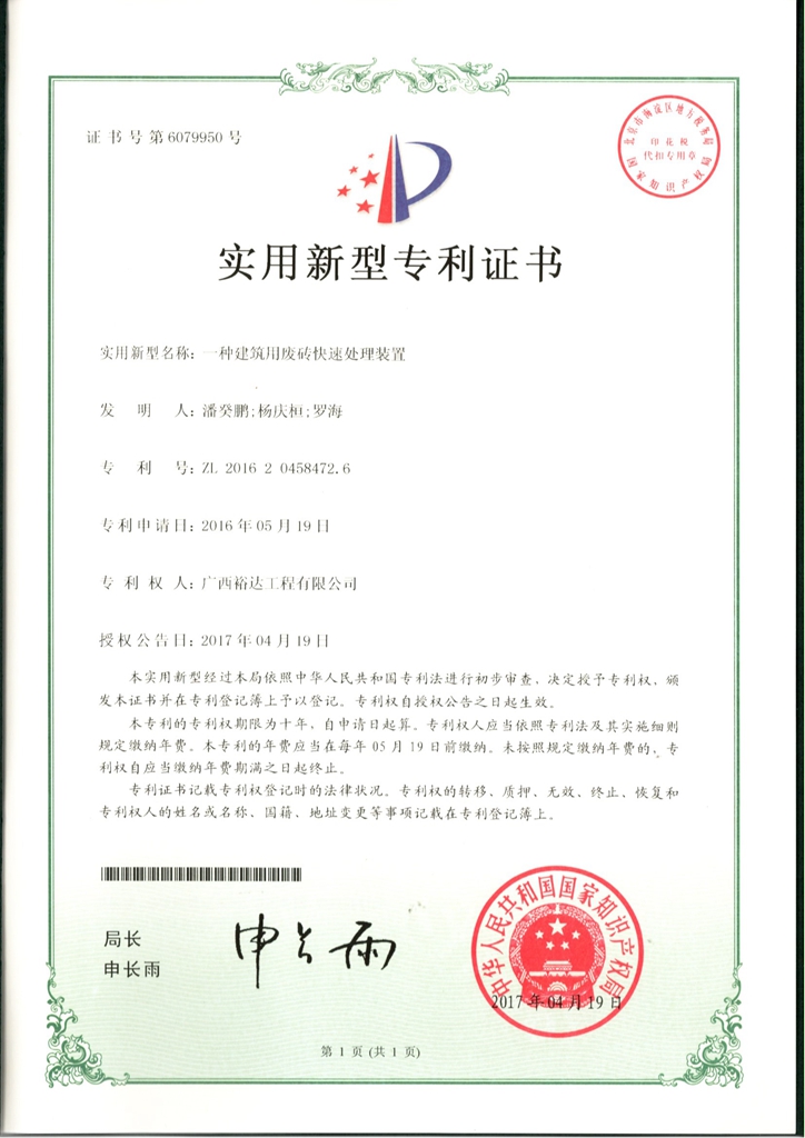 2017年实用新型专利证书(一种建筑用废砖快速处理装置)