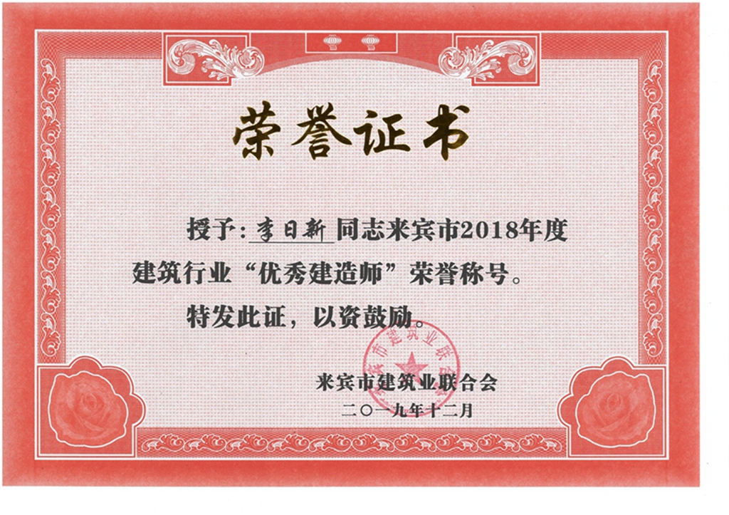 李日新来宾市2018年度建筑行业“优秀建造师”荣誉称号